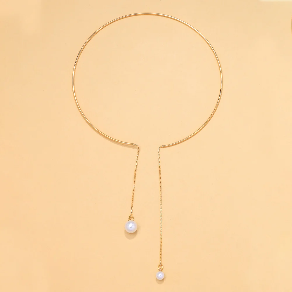 Name:StoneFans Trendy Metal Choker Necklace Pearl Dangle Concise Elegant Gold Open Tassel Pendant Necklace Bridal Women Jewelry